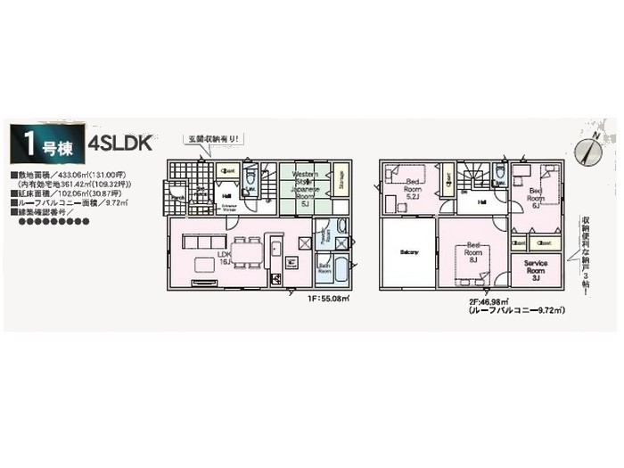 | 土地面積 | 433.06m² 実測 (内有効宅地361.42m2) | ||