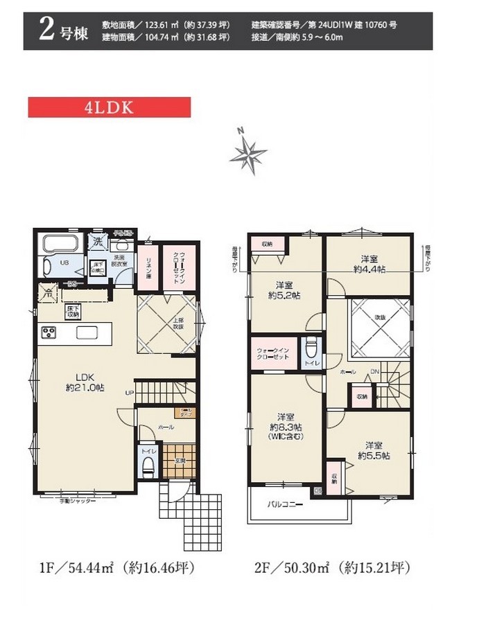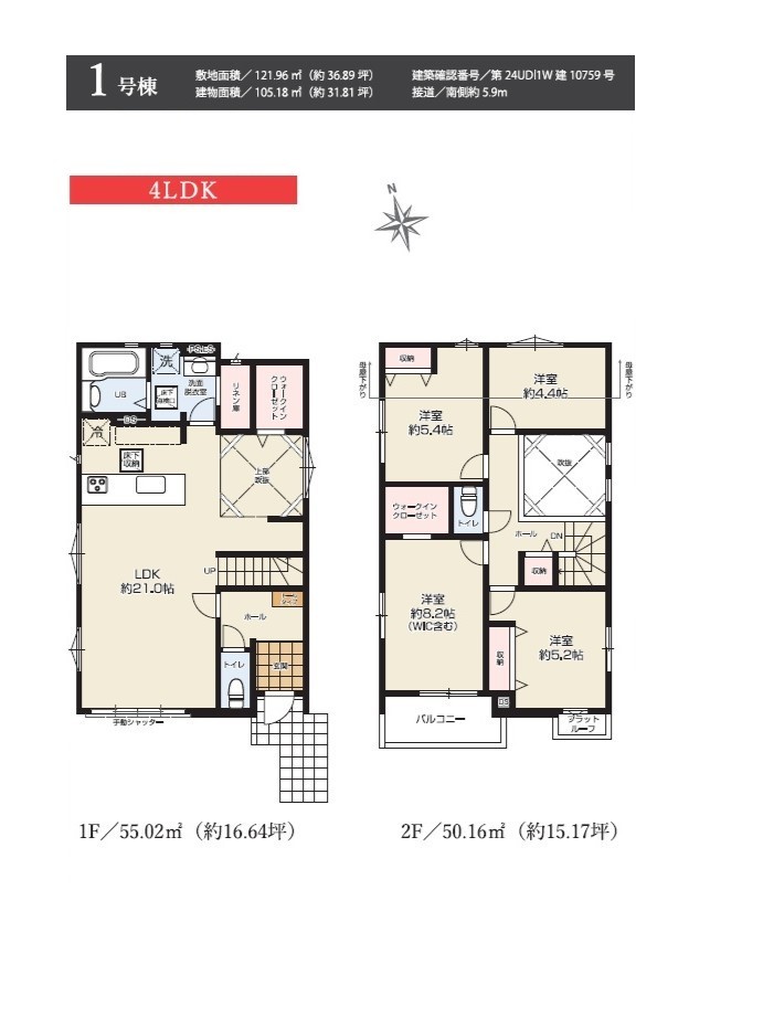 | 建物面積 | 104.74m² ~ 105.18m² 実測 | ||