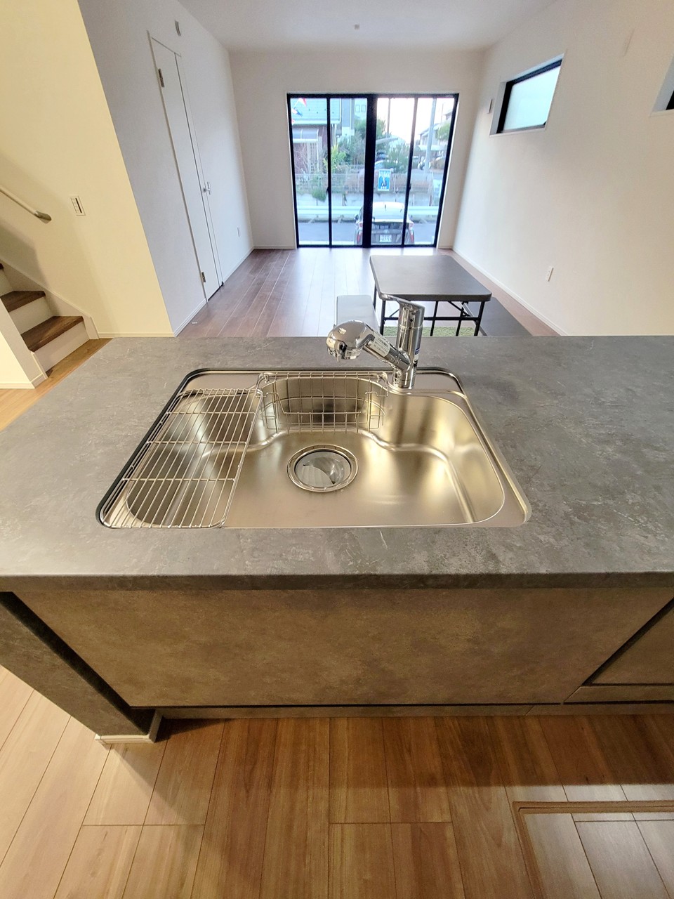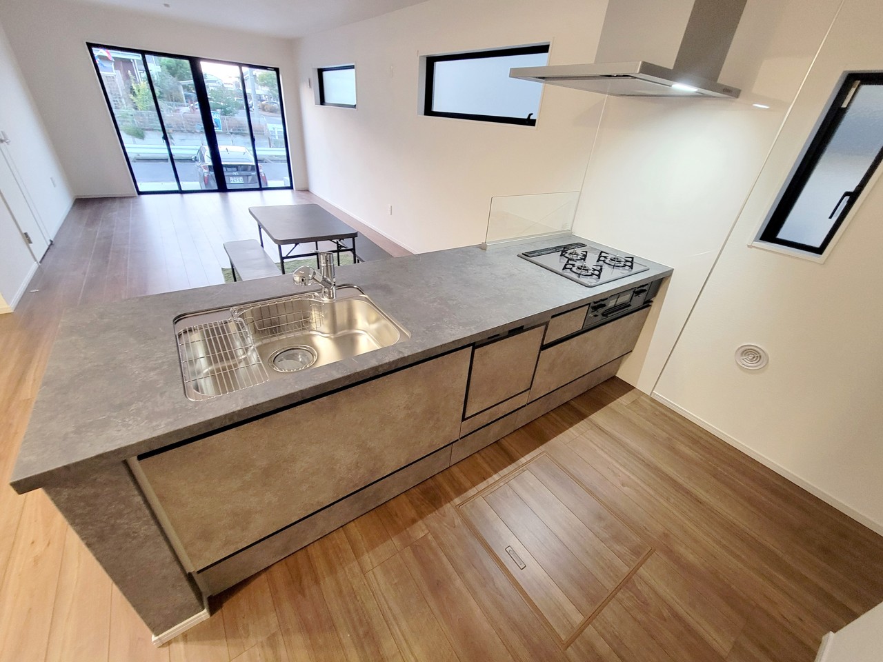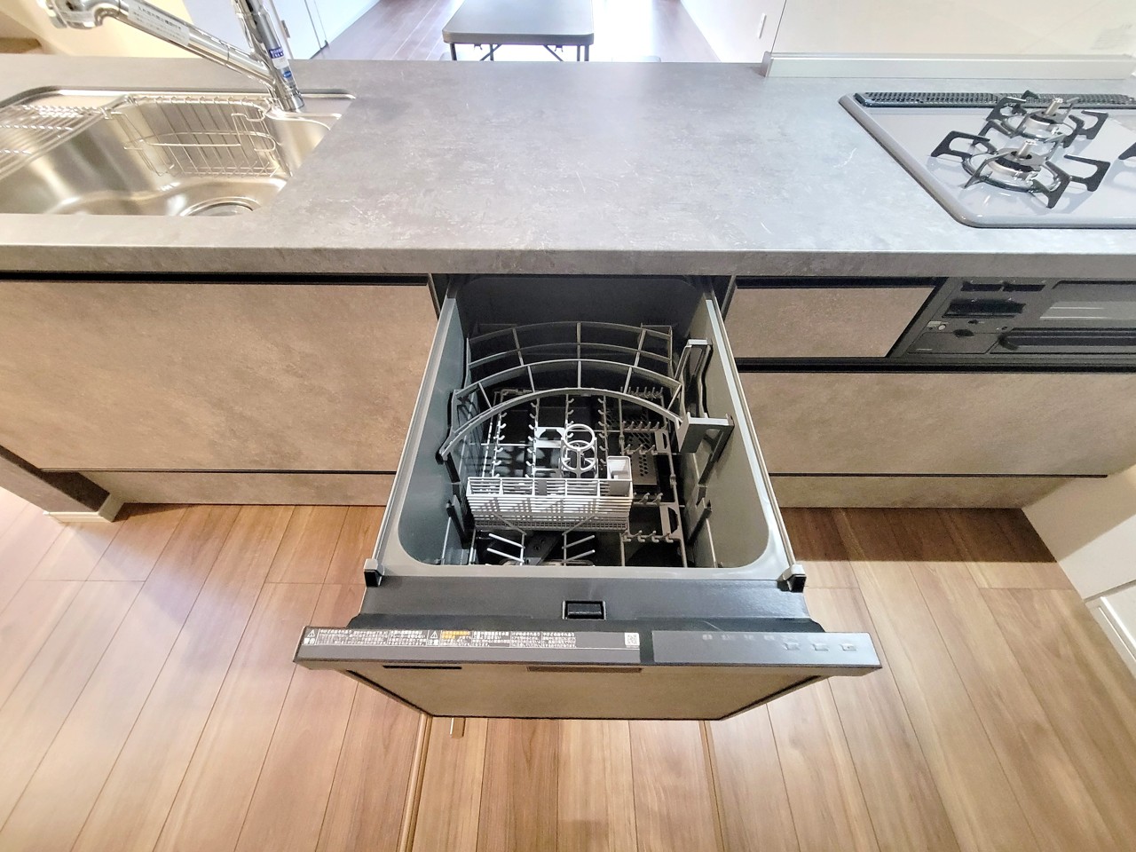 ・スライド収納付きシステムキッチン。出し入れもスムーズ♪
