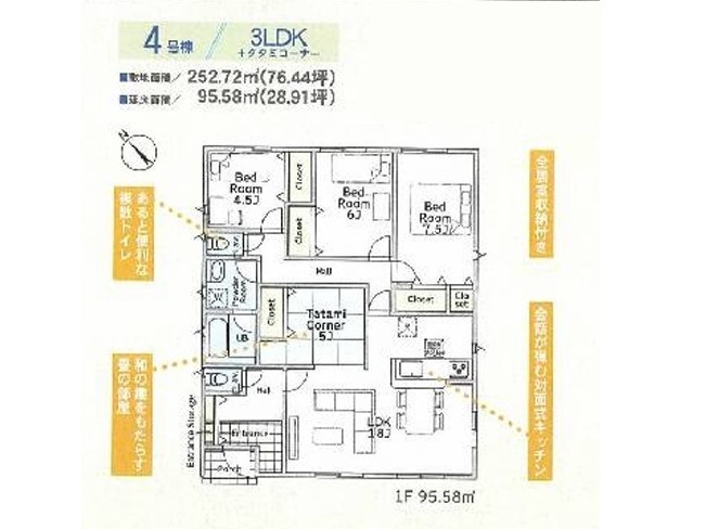 | 間取 | 3LDK+タタミコーナー (LDK18帖、洋室7.5帖、洋室6帖、洋室4.5帖) | ||