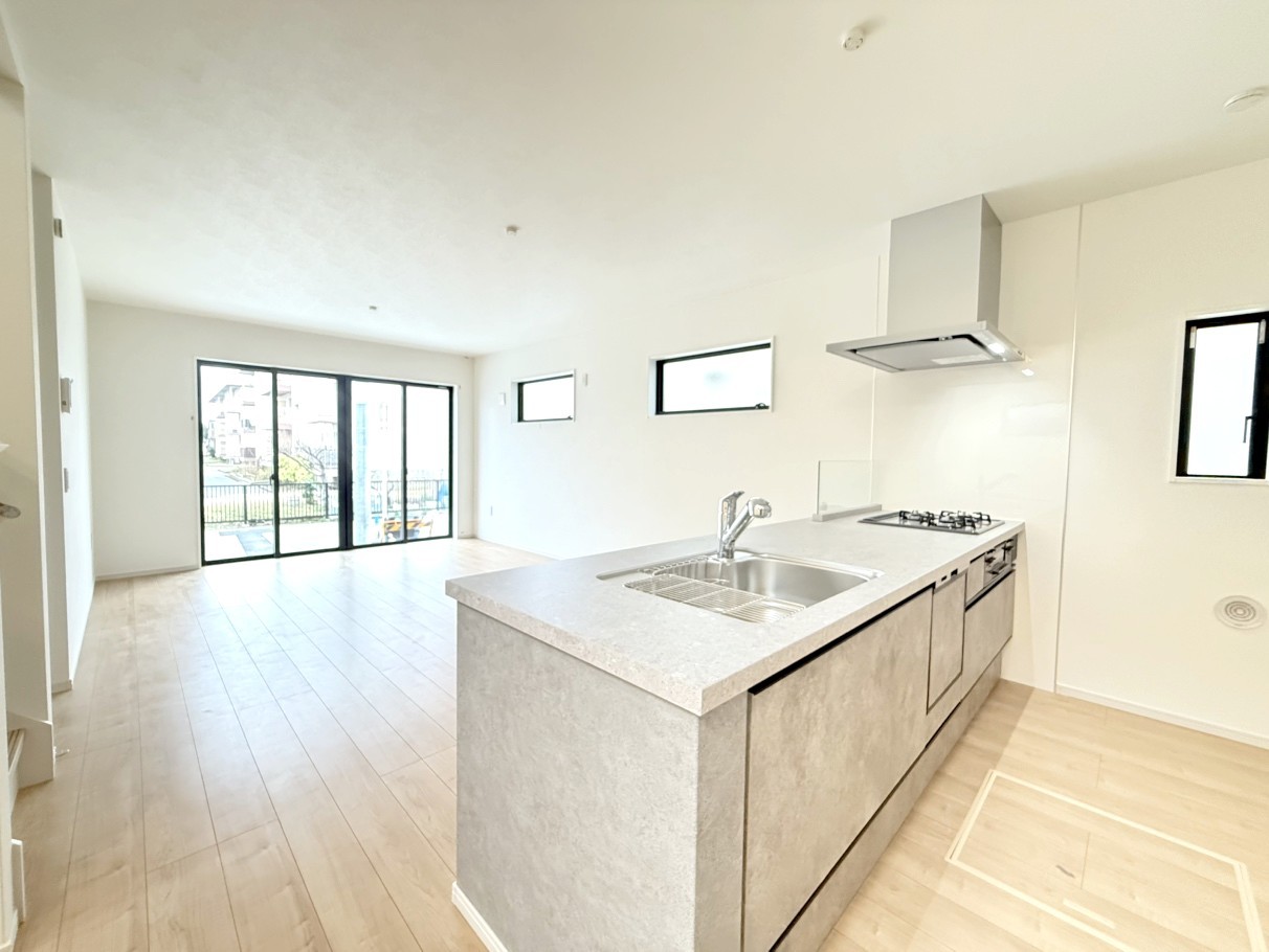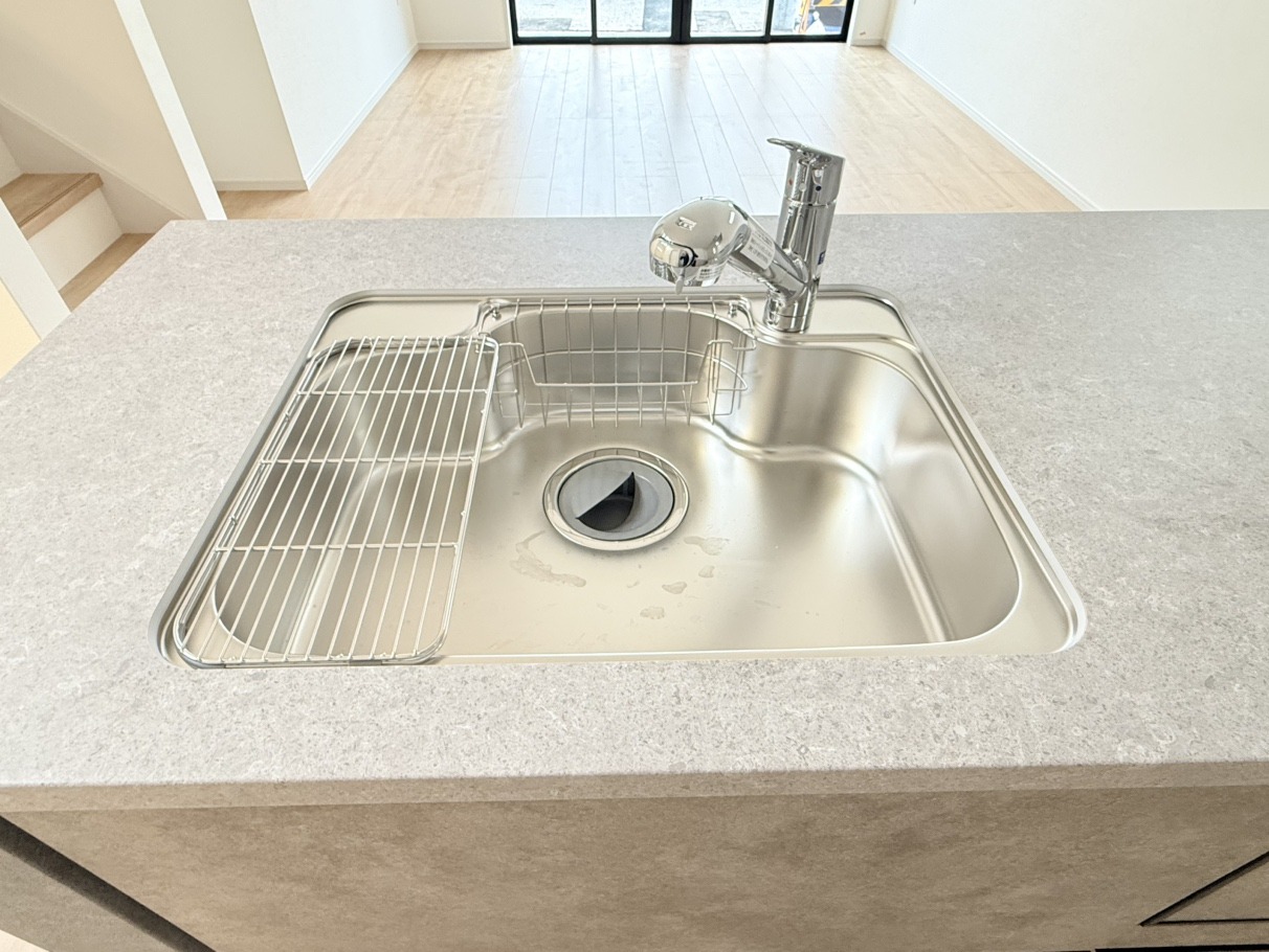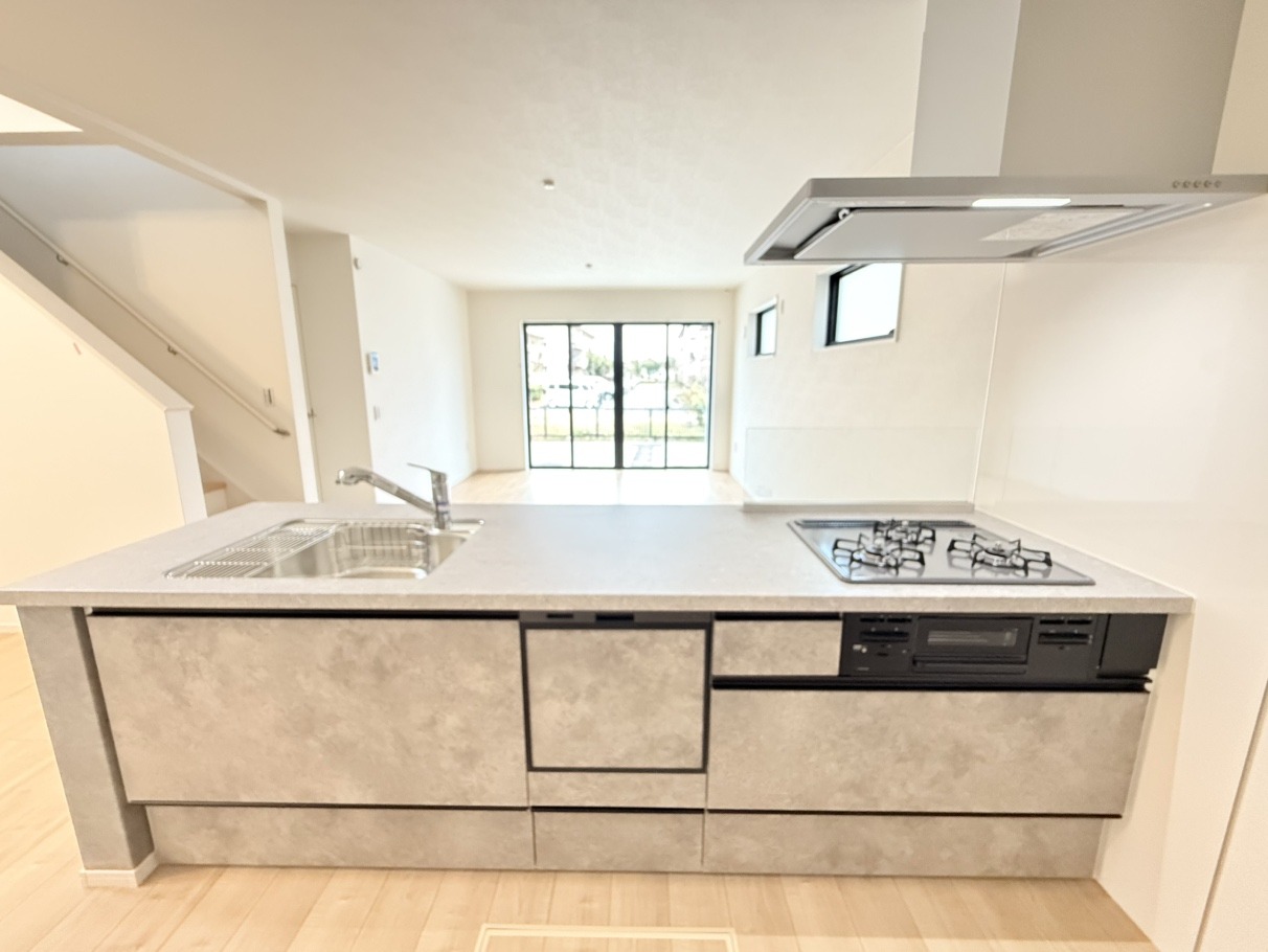 リビングの様子を見ながら調理ができる対面キッチン。 モデル棟