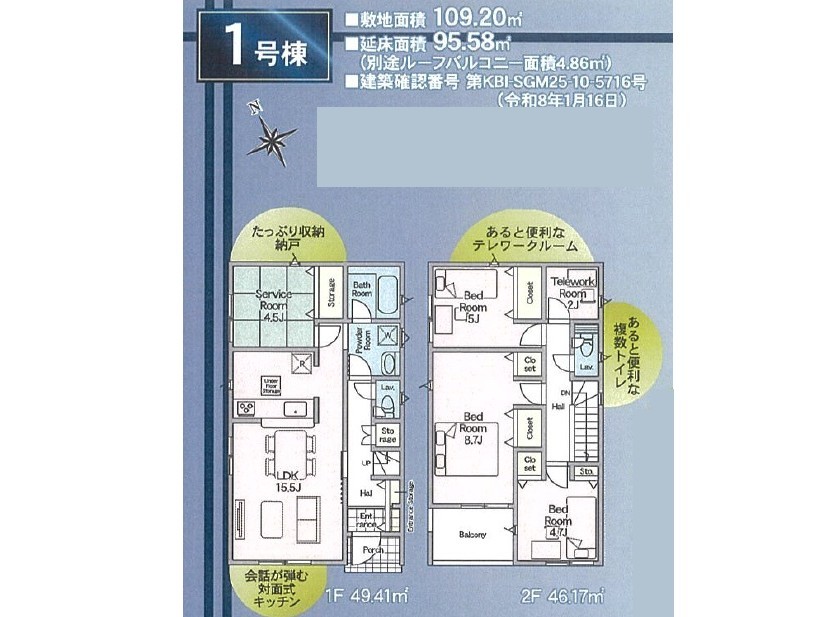 | 土地面積 | 109.2m² ~ 110.86m² 実測 (セットバック持分有) | ||