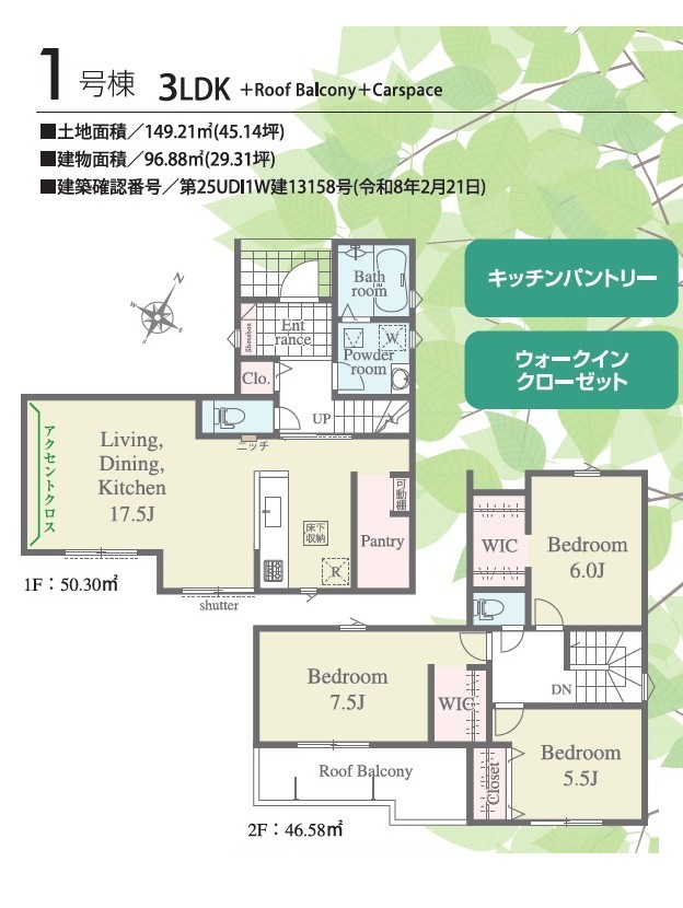 | 間取 | 3LDK (LDK17.5帖、洋室7.5帖、洋室6帖、洋室5.5帖) | ||
